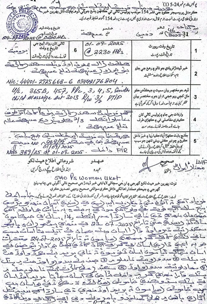 एफआईआर (संख्या 468/25, दिनांक 01-09-2025) के अनुसार, शारदा ओड 23 जुलाई 2025 को अपने घर से लापता हो गई थी। उसकी मां और रिश्तेदारों द्वारा बेतहाशा खोजबीन के बावजूद, उसका कोई पता नहीं चला। अगले दिन यह पुष्टि हुई कि नाबालिग लड़की को सिकंदर खराट सहित कुछ लोगों के समूह ने अगवा कर लिया और जबरन कैद कर लिया।शिकायत में आगे कहा गया है कि आरोपियों ने न केवल शारदा का अपहरण किया, बल्कि रात में उसके घर में घुसपैठ भी की, जिससे यह एक पूर्व नियोजित अपराध प्रतीत होता है। लड़की के साथ कथित तौर पर बलात्कार किया गया, जबरन धर्म परिवर्तन कराया गया और सिंध चाइल्ड मैरिज रेस्ट्रेंट एक्ट 2013 का उल्लंघन करते हुए अवैध शादी कर दी गई।