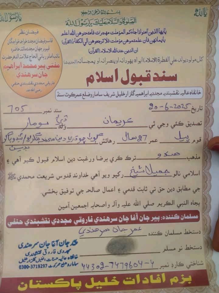 सिंध से सामने आए एक हालिया घटनाक्रम में, 27 वर्षीय हिंदू महिला करीमन भील, जो सोमार की बेटी हैं और मीरपुरखास की निवासी हैं, ने reportedly इस्लाम धर्म अपना लिया है और एक स्थानीय व्यक्ति से विवाह कर लिया है।
