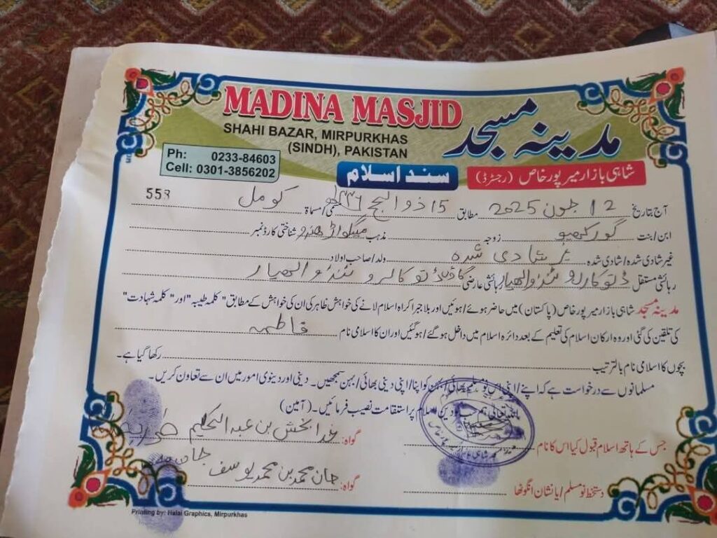 рдкрд╛рдХрд┐рд╕реНрддрд╛рди рдХреЗ рд╕рд┐рдВрдз рдкреНрд░рд╛рдВрдд рд╕реЗ рдПрдХ рдФрд░ рджрд░реНрджрдирд╛рдХ рдШрдЯрдирд╛ рд╕рд╛рдордиреЗ рдЖрдИ рд╣реИред рдХреЛрдорд▓ рдореЗрдШрд╡рд╛рд░, рдЬреЛ рдХрд┐ рдЯрдВрдбреЛ рдЕрд▓реНрд▓рд╛рд╣рдпрд╛рд░ рдирд┐рд╡рд╛рд╕реА рдФрд░ рдЧреЛрд░рдЦрд┐рдпреЛ рдХреА рдмреЗрдЯреА рд╣реИ, рдХреЛ рдХрдерд┐рдд рддреМрд░ рдкрд░ рдЬрдмрд░рди рдЗрд╕реНрд▓рд╛рдо рдзрд░реНрдо рдореЗрдВ рдкрд░рд┐рд╡рд░реНрддрд┐рдд рдХрд┐рдпрд╛ рдЧрдпрд╛ рд╣реИред рд░рд┐рдкреЛрд░реНрдЯреЛрдВ рдХреЗ рдЕрдиреБрд╕рд╛рд░, рдХреЛрдорд▓ рдХреЛ рдореАрд░рдкреБрд░рдЦрд╛рд╕ рдХреЗ рд╢рд╛рд╣реА рдмрд╛рдЬрд╛рд░ рд╕реНрдерд┐рдд рдорджреАрдирд╛ рдорд╕реНрдЬрд┐рдж рд▓реЗ рдЬрд╛рдпрд╛ рдЧрдпрд╛, рдЬрд╣рд╛рдБ рдЙрд╕рдиреЗ рд╕рд╛рд░реНрд╡рдЬрдирд┐рдХ рд░реВрдк рд╕реЗ рдХрд▓рд┐рдорд╛ рдкрдврд╝рд╛ рдФрд░ рдЙрд╕рдХрд╛ рдирдпрд╛ рдирд╛рдо рдлрд╛рддрд┐рдорд╛ рд░рдЦрд╛ рдЧрдпрд╛ред